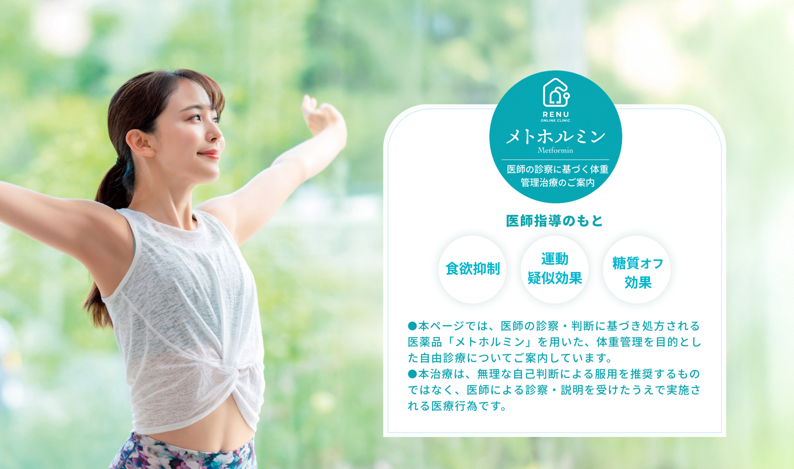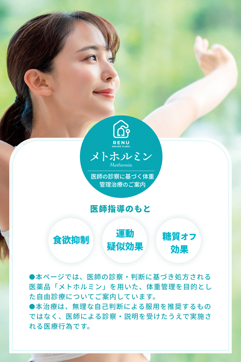 メトホルミンはエネルギー代謝を改善し、穏やかに体重を落とすため、体への負担が少なくリバウンドを防ぎます。徐々に太りにくい体質へと変わっていきます。